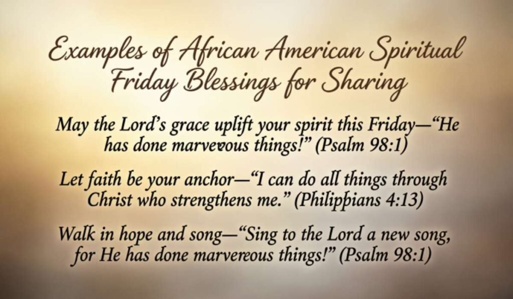African American Spiritual Friday Blessings often honor African American history, cultural heritage, and the strength of African ancestors. These Friday blessings inspire reflection, faith, and spiritual growth. They remind communities about resilience, prayer, worship, and divine guidance.